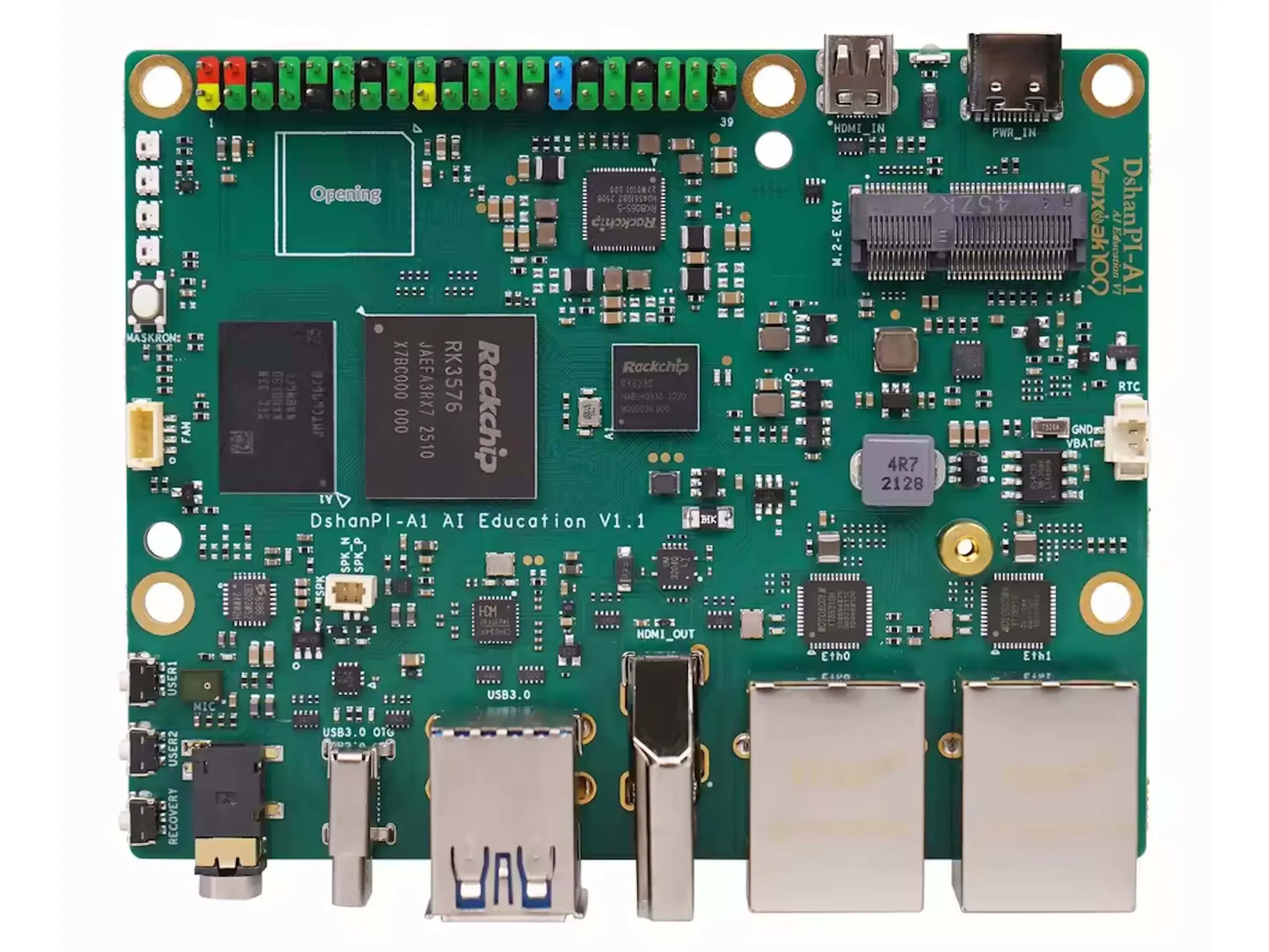 Der DshanPi-A1 ist ein Einplatinenrechner, welcher sich wie etwa der Raspberry Pi (im Preisvergleich) sehr vielseitig nutzen lassen dürfte. So kann das System im Grunde als mehr oder weniger klassischer Desktop-PC mit dann aber wahrscheinlich doch stark limitierter Performance genutzt werden, allerdings dürften auch Maker ihre Freude mit dem Gerät haben So bringt das System eine aus 40 Pins bestehende Stiftleiste mit, welche die Anbindung von Sensoren und Aktoren entsprechend unterstützt. Denkbar wäre damit etwa die Steuerung eines Motors in Abhängigkeit von einer Temperatur. Messwerte lassen sich drahtlos dann vom Einplatinenrechner natürlich auch etwa an einen Server liefern. Die Netzwerkanbindung ist kabelgebunden über zwei Ethernet-Ports mit jeweils Gigabit-Geschwindigkeit möglich. WiFi und Bluetooth lassen sich über ein M.2-Modul nachrüsten.