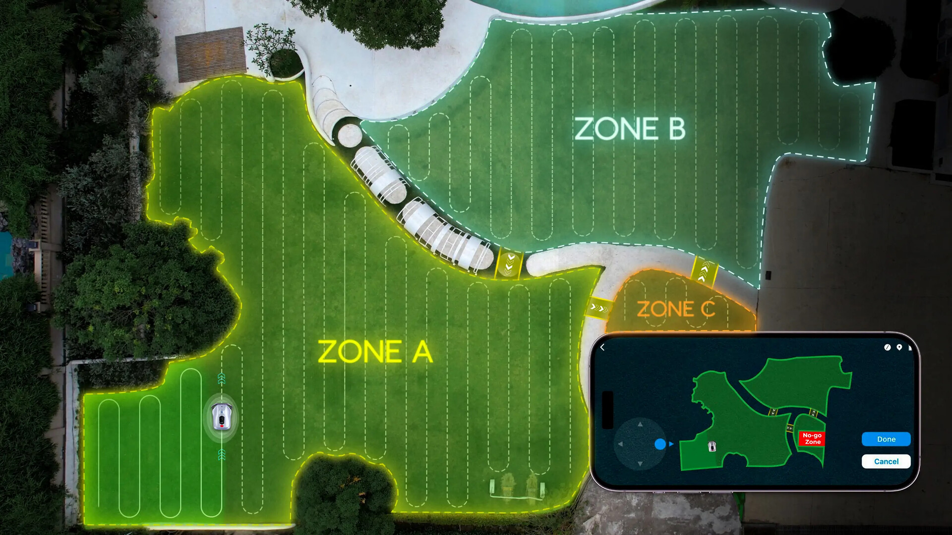 Bei der Arbeit geht der Mäher systematisch und nicht chaotisch vor, fährt also in Bahnen. Dank Multi-Zonen-Management können auch mehrteilige Rasenflächen abgearbeitet werden. Die Schnitthöhe lässt sich elektrisch via App zwischen 30 und 85 mm einstellen. Ein weiterer Vorteil ist die intelligente Hinderniserkennung per Laser und visuellen Sensoren, dank der Bäume, Igel, Spielzeug und Co gekonnt umfahren werden sollen. Die Ladestation soll sich zudem auch in einer Garage oder einem anderen Raum installieren lassen, sodass der Mähroboter gegen Diebstahl geschützt laden und warten kann.