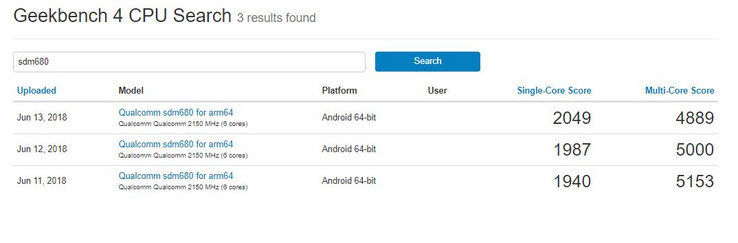 Mit Single-Core-Ergebnissen von knapp über 2.000 Punkten und einem Multi-Core-Score von bislang maximal 4889 Punkten scheint Qualcomm hier noch einen Mittelweg zwischen Snapdragon 660 und Snapdragon 710 gehen zu wollen. Interessanterweise ist der Single-Core-Wert mit 2.049 Punkten sogar über dem Ergebnis der ersten Snapdragon 710-Samples in Form des Xiaomi Mi 8 SE (siehe Vergleich hier). Beim Multi-Core-Wert hat der Snapdragon 710 aber dann doch noch einen etwa 1000 Punkte-Vorsprung vor dem Snapdragon 680, siehe auch Bilder unten.