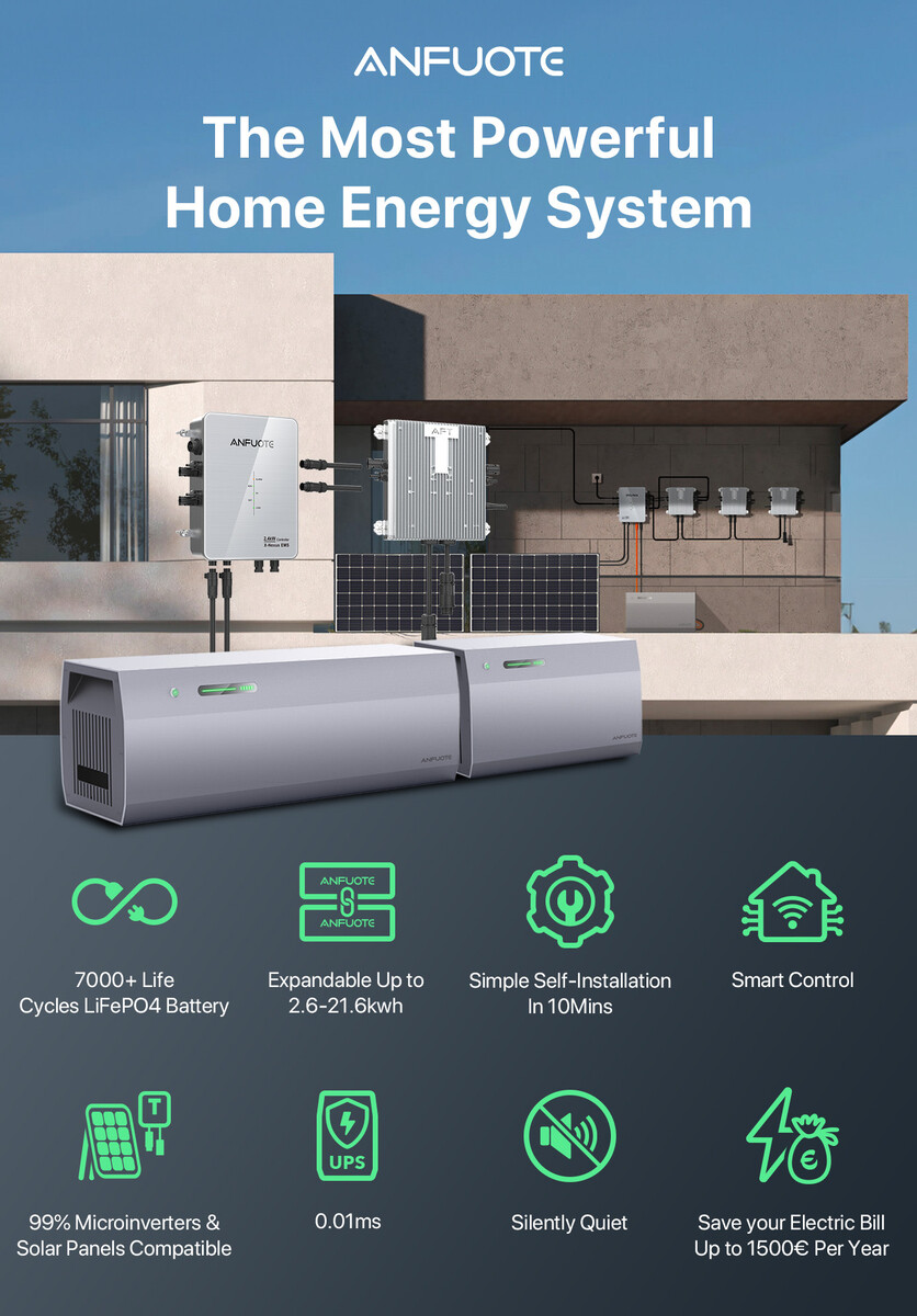 Der Speicher kann einen Output von bis zu 2.400 W bereitstellen und hat ganze drei MPPT verbaut. Dazu punktet das System mit USV-Funktion, Smart- & Remote-Steuerung und einer einfachen Installation. Das Anfuote Balcony Solar Energy Storage System soll mit quasi allen Solaranlagen auf dem Markt kompatibel sein, laut Hersteller bis zu 1.500 Euro Stromkosten im Jahr sparen und sich binnen zwei bis drei Jahren armortisieren, wobei dies natürlich von vielen Faktoren abhängig ist.