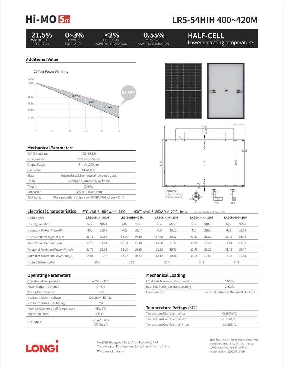 Die Halbzellenmodule mit einer Leistung von 405 Wp haben eine Höhe von 1.722 Millimetern und eine Breite von 1.134 Millimetern und sind damit ideal für den Einsatz im privaten sowie gewerblichen Bereich. Der Hersteller gewährt 12 Jahre Produktgarantie und 30 Jahre Garantie auf 84,8 Prozent der angegebenen Nennleistung.
