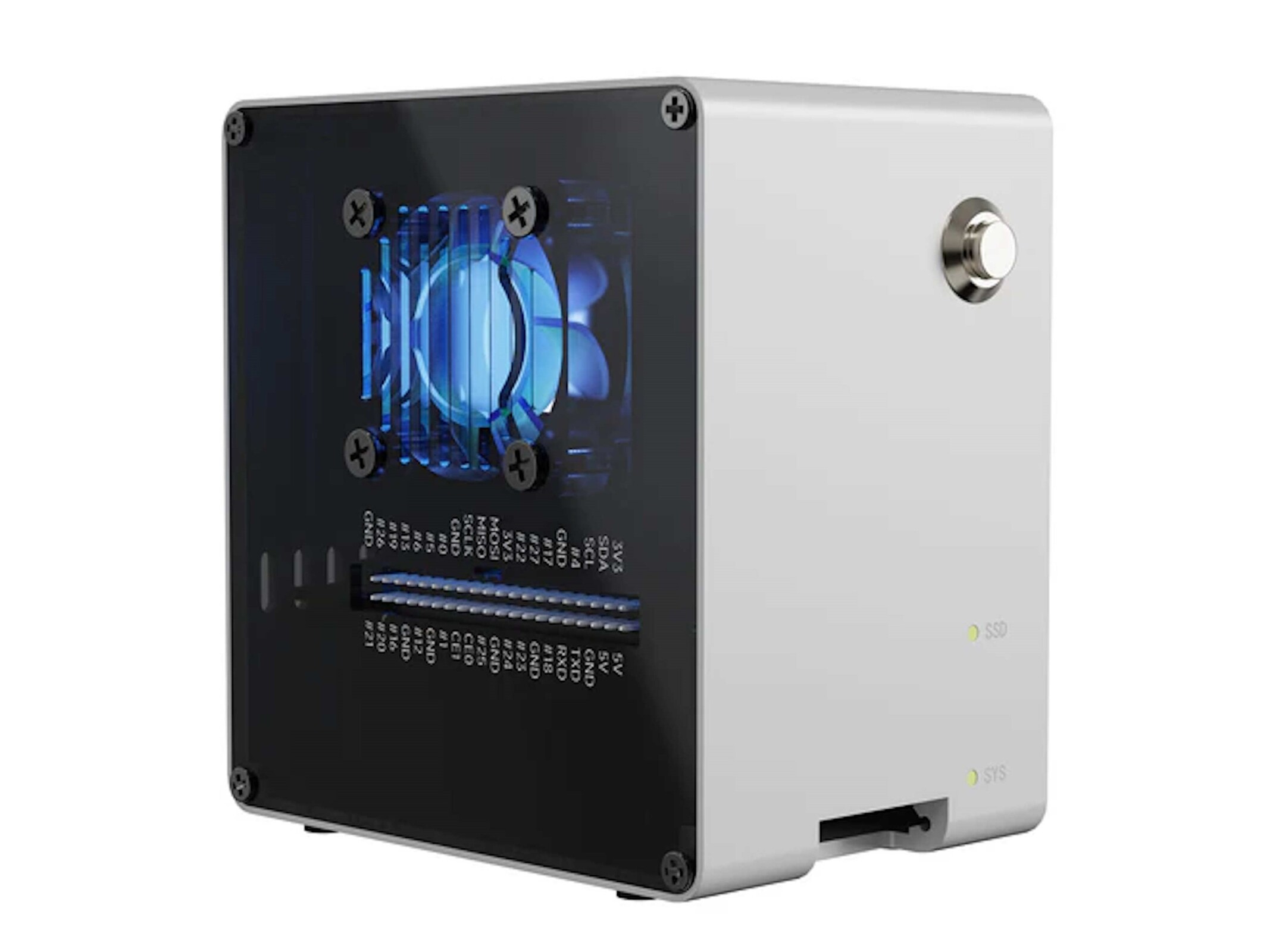 Optional kann auch noch ein Bildschirm gleich mit bestellt werden. Das Gehäuse selbst besteht aus einer Aluminiumlegierung, die Seitenpaneels bestehen aus Kunststoff. Quasi in einem der beiden Seitenfenster befindet sich die GPIO-Stiftleiste, dementsprechend lassen sich externe Sensoren und Aktoren auch weiterhin anbinden. Verbaut ist ein Lüfter mit RGB-Beleuchtung und einem Durchmesser von 40 Millimeter, die nicht nur am Lüfter vorhandene RGB-Beleuchtung lässt sich konfigurieren. Es ist Platz für eine Erweiterungskarte bis zum M.2 2280-Format, welche über eine PCIe 2.0-Lane angebunden wird. Denkbar ist die Nutzung einer SSD oder auch einer AI-Erweiterungskarte.