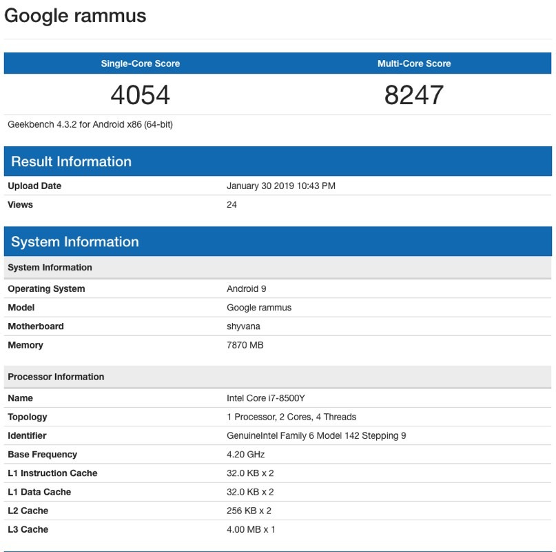 Kürzlich ist auch noch eine weitere Variante des möglichen Google-Tablets aufgetaucht. Dies scheint jedoch das gleiche Rammus-Gerät zu sein, das bereits im Oktober die Gerüchte-Runde machte, jetzt aber mit einem aktualisierten Betriebssystem und einer anderen Geekbench-Testversion. Es scheint also wahrscheinlich, dass es nur zwei Modelle gibt - eines mit einem Intel Core m3-8100Y und 4 GB RAM und ein weiteres mit einem i7-8500Y und 8 GB RAM. "Google Rammus" dürfte als Name verwendet werden. Es wurde darauf hingewiesen, dass das leistungsstärkere Gerät eine ähnliche Hardware wie die i7-Version des Google Pixel Slate verbaut hat, womit Rammus möglicherweise eine billigere Version des teuren Tablets werden könnte, die jedoch ebenfalls mit einem i7-Prozessor ausgestattet ist.