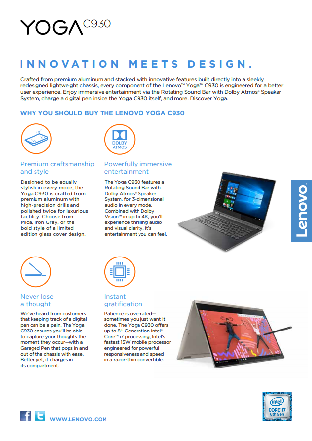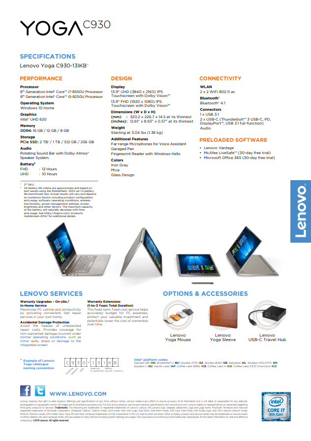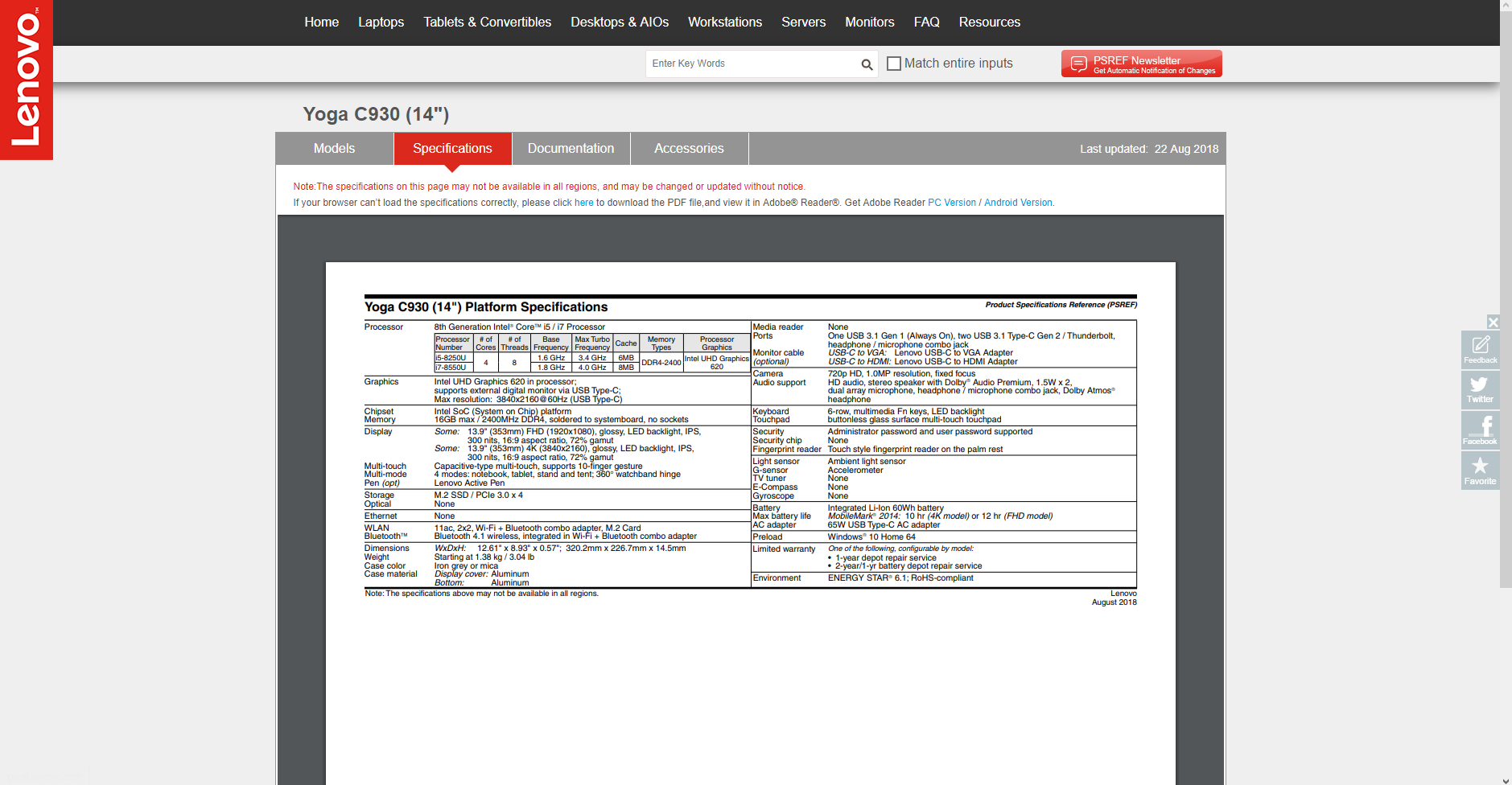 So heute geschehen mit dem Lenovo Yoga C930. Der Nachfolger des Lenovo Yoga 920 wurde vor kurzem schon einmal geleakt und wird für die IFA 2018 erwartet, die in etwas mehr als einer Woche in Berlin stattfindet. Dabei ist der heutige Leak umfangreicher, denn Lenovo hat das Datenblatt des Yoga C930 gleich zweifach online gestellt. Zudem gibt es erste (wenn auch pixelige) Bilder des Lenovo Yoga C930, das vor allem mit dem HP Spectre x360 13 konkurrieren dürfte.