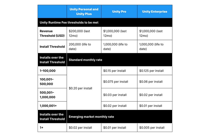 Unity hat in einem Blogeintrag ein neues Lizenz-Modell angekündigt, das sich von den branchenüblichen Modellen unterscheidet. Entwickler mit einer Unity Personal oder Plus Lizenz müssen künftig 0,20 US-Dollar pro Spiele-Download bezahlen, bei Unity Pro und Enterprise Kunden variiert diese Gebühr zwischen 0,15 und 0,01 US-Dollar – ab 100.000 Downloads pro Monat gibts Mengenrabatt.