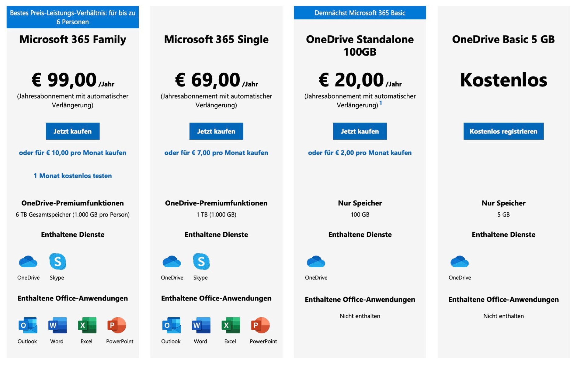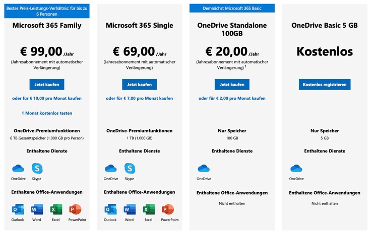 Dasselbe gilt für die beliebten Office-Apps Word, PowerPoint, Excel und OneNote, die weiterhin nur im Microsoft 365 Single-Abonnement angeboten werden, das inklusive 1 TB Cloud-Speicher 7 Euro pro Monat oder aber 69 Euro pro Jahr kostet. Über das Family-Abonnement kann dieser Zugang für 99 Euro pro Jahr mit bis zu sechs Personen geteilt werden. Microsoft weist darauf hin, dass die Web-Versionen der Office-Anwendungen ohnehin kostenlos verfügbar sind, solange der Nutzer einen Microsoft-Account besitzt. Nähere Details zu den unterschiedlichen Abonnements, die Microsoft anbietet, gibt es auf der Webseite des Unternehmens.
