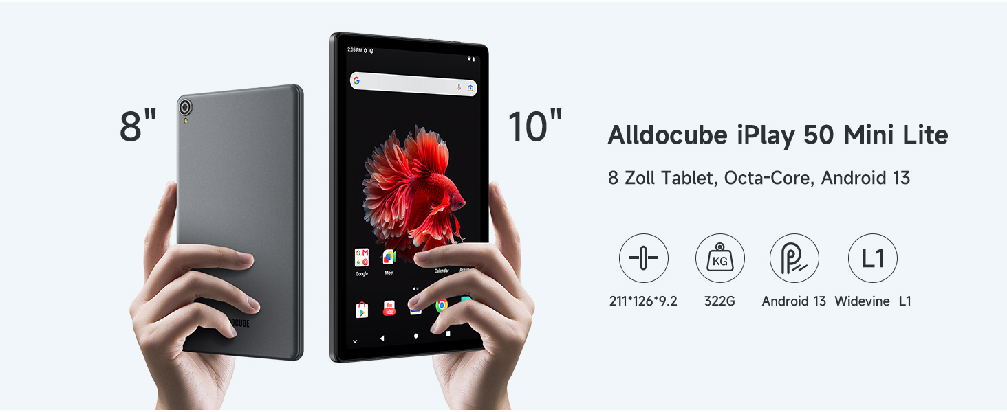 Das Alldocube iPlay 50 mini Lite ist nicht nur ein sehr günstiges, sondern mit einem 8 Zoll großen Display auch ein sehr handliches Tablet. Das IPS-Panel löst mit 1.280 x 800 Pixeln auf. Als Prozessor ist der mit acht Kernen und bis zu 1,8 GHz Taktrate aufwartende Chpsatz Allwinner A523 verbaut. Dazu stecken 4 GB physischer und 4 GB virtueller RAM sowie 64 GB ROM in dem 322 g leichten Tablet. Der Speicherplatz kann über eine microSD-Karte um bis zu 512 GB erweitert werden.