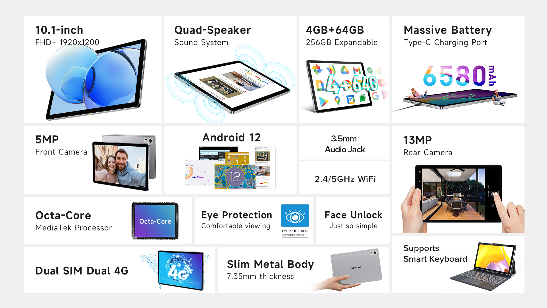 Neben dem 10,1 Zoll großen Display mit FHD+Auflösung (1.920 x 1.200 Pixel) verbaut der Hersteller zudem einen 6.580 mAh großen Akku und Quad-Lautsprecher in dem nur gut 7 mm dünnen Metallgehäuse. Zur weiteren Ausstattung zählen neben einer 13 MP Hauptkamera auf der Rückseite auch eine 5 MP Frontkamera, die unter anderem für Face Unlock genutzt werden kann. Als Betriebssystem ist pures Android 12 vorinstalliert.