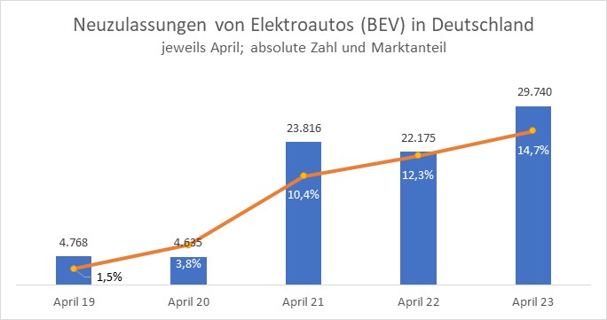Der Absatz elektrifizierter Neuwagen (Elektroautos und Plug-in-Hybride zusammen) sank in Deutschland im Vergleich zum Vorjahresmonat um 5,3 Prozent, der Marktanteil schrumpfte von 24,3 auf 20,5 Prozent. Immerhin: Die Neuzulassungen reiner E-Autos stiegen im April 2023 gegenüber dem Vorjahresmonat um 34 Prozent. Im Zuge fehlender Subventionen schrumpften die Zahl der Neuzulassungen von Plug-in-Hybriden erneut sehr deutlich um 46 Prozent gegenüber dem Vorjahresmonat April 2022. Der Marktanteil dieser Antriebsart hat sich im Vergleich zum Vorjahr von 12,0 auf 5,8 Prozent mehr als halbiert.