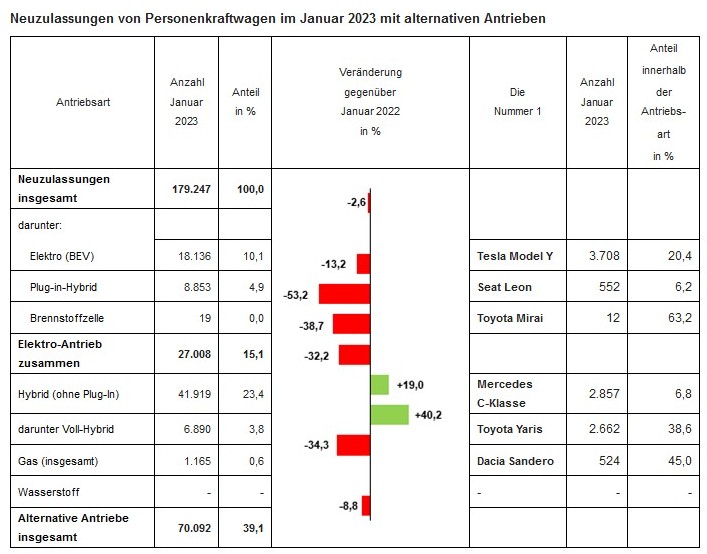 Etwas besser sieht es für die vollelektrischen Autos (BEV) bei den Zulassungszahlen des Kraftfahrt-Bundesamts für Januar 2023 und den Ausblick des Verbands der Autoindustrie für das Gesamtjahr aus. Die Zahl der im Januar neu zugelassenen und vollelektrischen Autos schrumpfte zum Vorjahresmonat um minus 13,2 Prozent auf 18.136 Stromer. Die meisten Neuzulassungen konnte in diesem Segment Tesla mit 3.708 Model Y Elektroautos verbuchen.