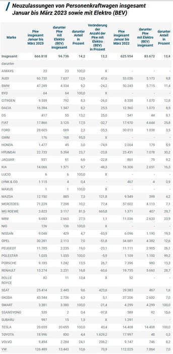 Spannend ist auch der Blick auf die Liste mit den Gesamt-Zulassungszahlen aller BEV-Marken, die das KBA für neu zugelassene, rein elektrische Autos, von Januar bis März 2023 erfasst hat. Aus der KBA-Liste geht hervor, dass beispielsweise die E-Auto-Hersteller aus China hierzulande noch nicht sehr viele neu zugelassene E-Autos im Jahr 2023 verzeichnen können.