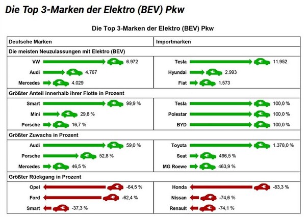 Dahinter folgt auf Platz 2 VW bei den am häufigsten neu zugelassenen vollelektrischen Autos (BEV). Den dritten Podiumsplatz in der Top 3 schnappt sich Audi mit 4.767 BEVs knapp vor Mercedes mit 4.029 rein elektrisch angetriebenen Stromern. Hyundai mit 2.993 reinen E-Autos rundet die Top 5 bei den BEV-Neuzulassungen ab. Fiat schafft es mit 1.573 batterieelektrischen Autos nicht mehr ins Top-5-Ranking des KBA.