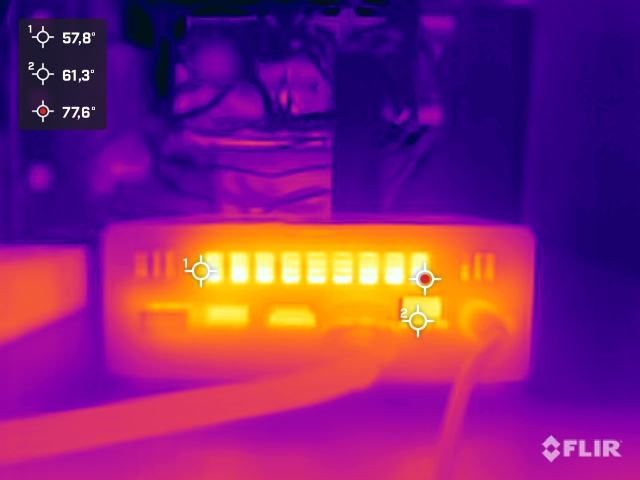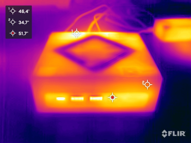 (+) Ohne Last messen wir eine durchschnittliche Temperatur von 27.8 °C auf der Oberseite. Der Klassendurchschnitt erreicht 32.5 °C.