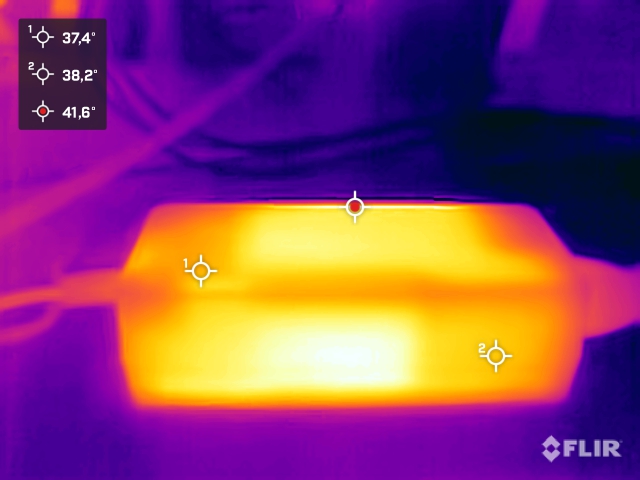 (+) Auf der Unterseite messen wir eine maximalen Wert von 39.9 °C (im Vergleich zum Durchschnitt von 36.4 °C).