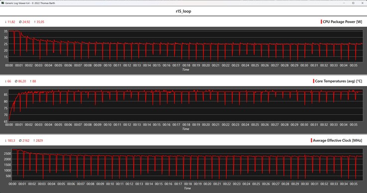 Die Gehäusetemperaturen sind im Leerlauf mit deutlich unter 30 °C unauffällig. Gleichwohl steigen die Temperaturen beim Stresstest spürbar an. Mit knapp über 40 °C sind diese aber unbedenklich. Beim Prozessor notieren wir maximal 91 °C in der Spitze, was dem thermischen Limit geschuldet ist. Zudem erkennen wir, dass unter Dauerlast nur noch 26 Watt erreicht werden, wohingegen bis zu 35 Watt möglich wären. Die verbaute Kühleinheit ist zu klein, um die komplette Abwärme abzuleiten.