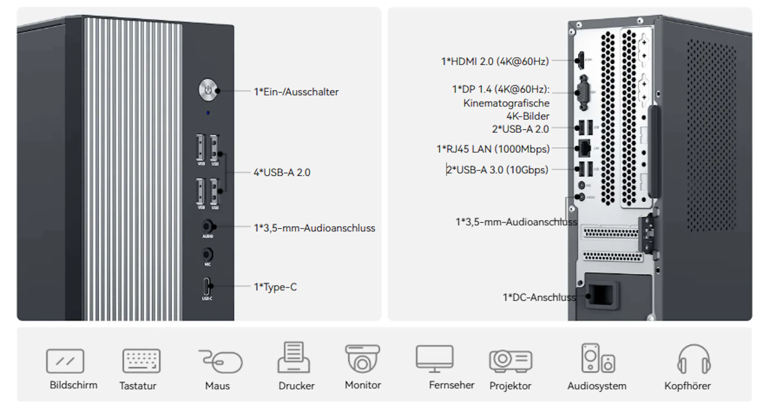 Bei den Anschlüssen schöpft Blackview beim NEX60 nicht unbedingt aus den Vollen. So ist die Nutzung nur mit zwei 4K-Bildschirmen gleichzeitig möglich. Dafür stehen jeweils einmal HDMI 2.0 und DisplayPort 1.4 bereit - auch wenn die Produktabbildungen wahrscheinlich fälschlicherweise einen inzwischen doch sehr untypischen VGA-Anschluss zeigen. Ethernet ist verbaut, wobei dieser Anschluss nur Gigabit-Geschwindigkeit bietet An der Front sind viermal USB 2.0 zu finden, dazu kommt auch noch einmal USB Typ C. Auf der Rückseite gibt es dann noch jeweils zweimal USB 2.0 und USB 3.0, wobei diese vier Anschlüsse jeweils im Typ A ausgeführt sind. Bei Blackview selbst ist der NEX60 für einen Preis von 706 Euro vorbestellbar. Der Versand soll am 30. März beginnen.