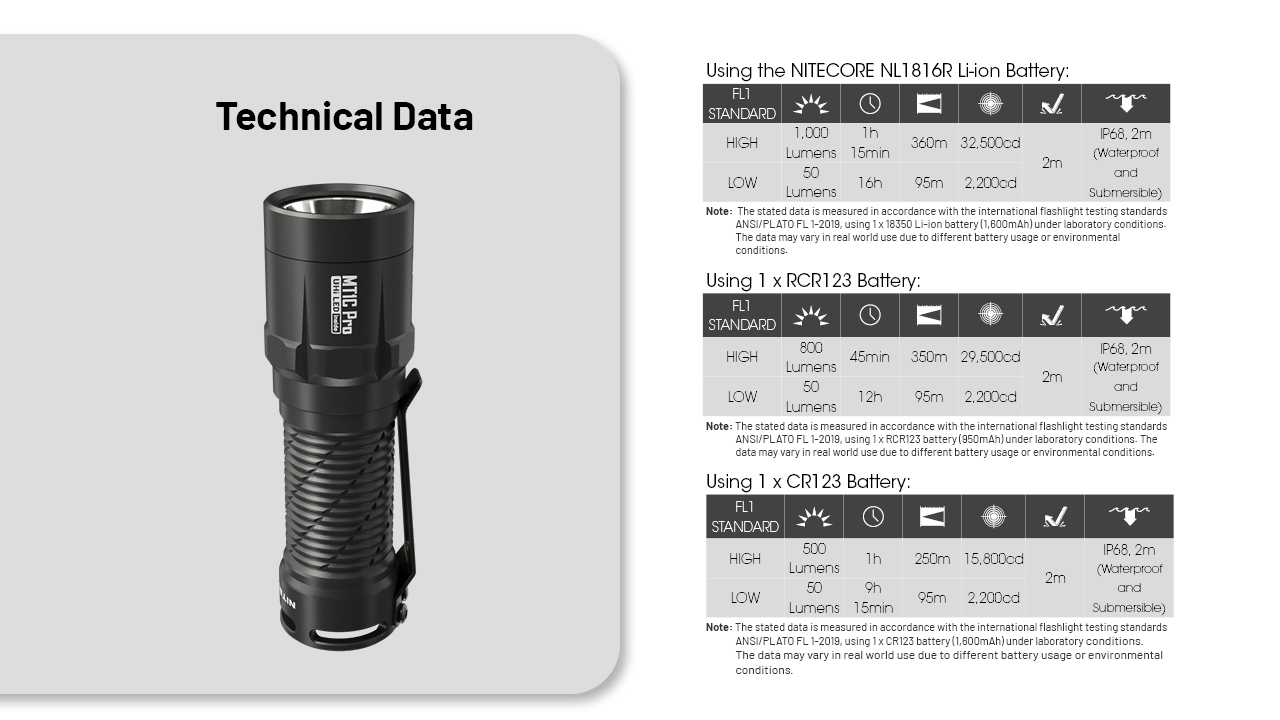 Die MT1C Pro ist zudem mit (R)CR123-Zellen kompatibel. Damit sind allerdings maximal 500 Lumen und 250 Meter möglich. Damit hält die Taschenlampe eine Stunde in der höchsten Stufe.