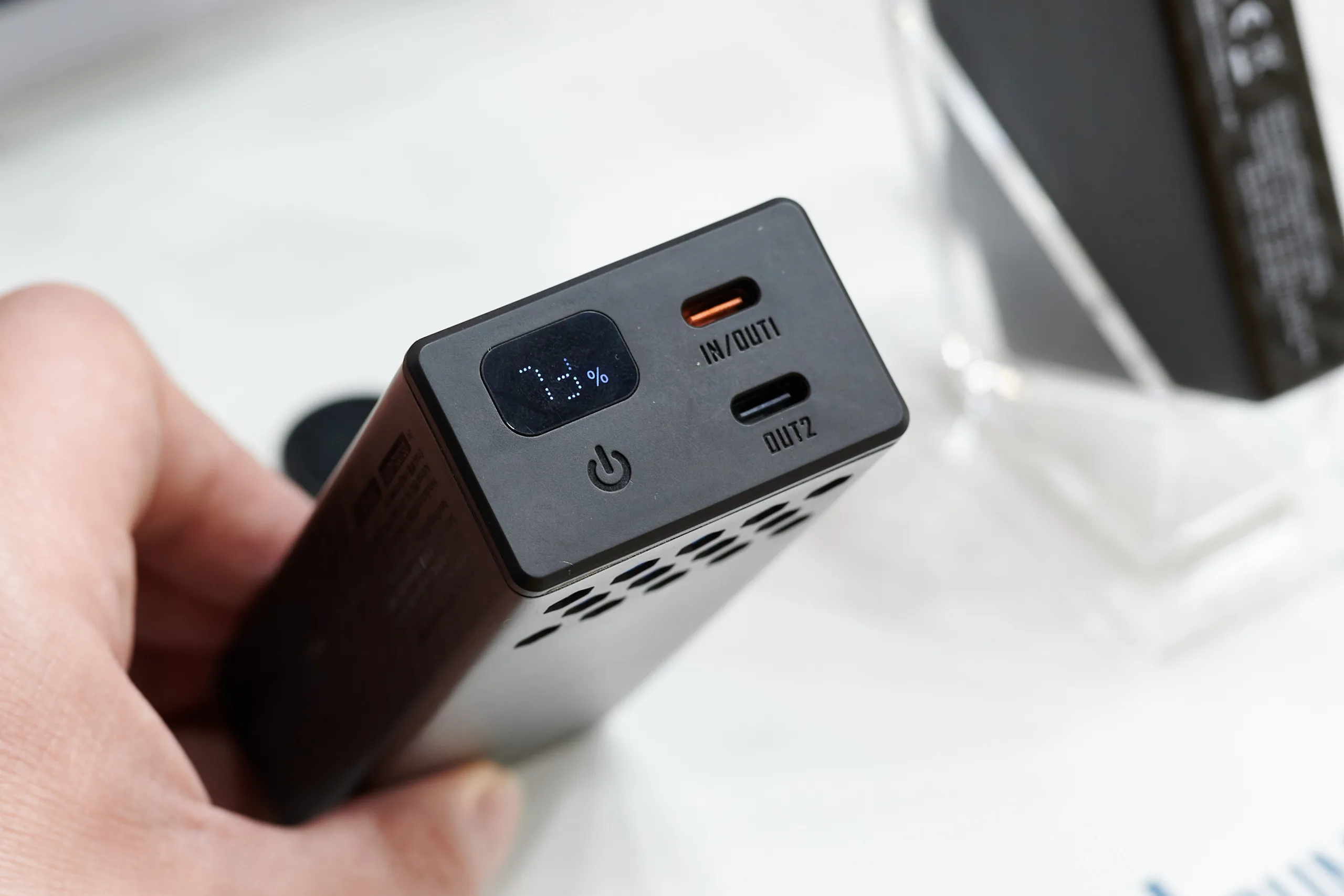 Immerhin fand sich etwas Platz für ein kleines Statusdisplay, das die Restkapazität in Prozent anzeigt. Für Nitecore ist das ungewöhnlich. Zum Laden von Geräten gibt es zwei USB-C-Anschlüsse. Einer kann für das Laden der Powerbank genutzt werden.