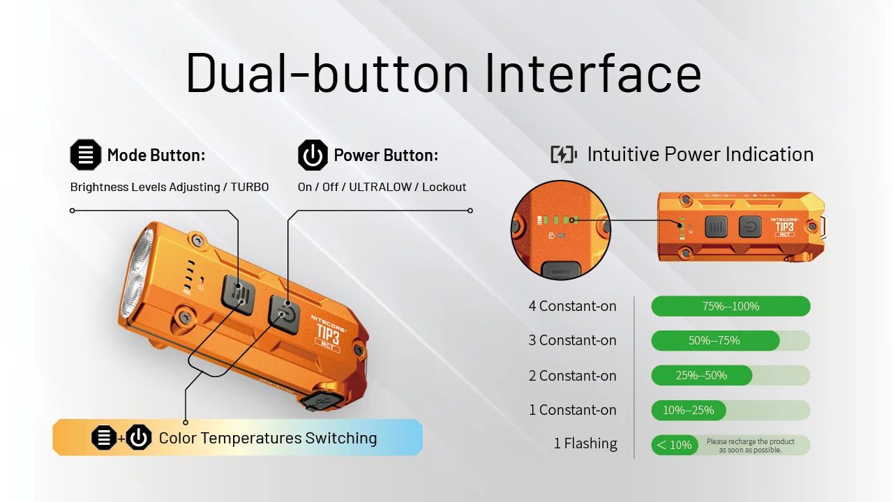 Neu ist das Umschalten zwischen drei Lichtfarben (MCT), wie das von der von uns getesteten Tini 3 bekannt ist. Über einen Schalter kann zwischen Warmweiß mit 3.000 Kelvin, Neutralweiß mit 4.500 Kelvin und Kaltweiß mit 6.500 Kelvin gewechselt werden. Wie bei den anderen MCT-Taschenlampen erreicht Nitecore das durch das bedarfsgerechte Mischen von LED-Kernen. 2 x 4 LEDs sind verbaut.