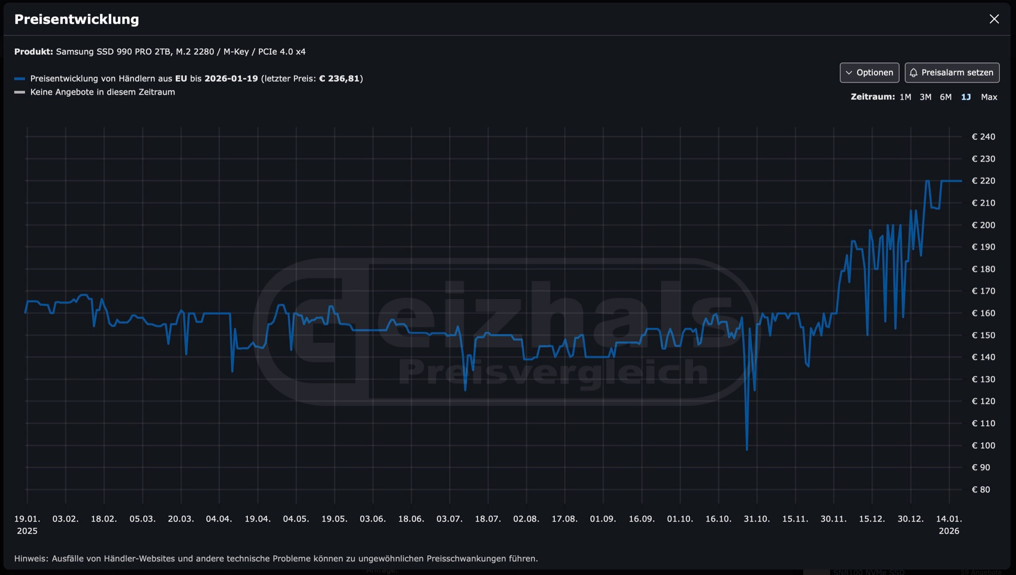 Nachdem AI-Unternehmen wie OpenAI einen immensen Teil der weltweiten DRAM-Produktion für sich beanspruchen, sind die Preise für Arbeitsspeicher über die vergangenen Monate um ein Vielfaches gestiegen. Doch auch SSDs wurden von dieser Krise nicht verschont – eine Samsung SSD 990 Pro mit 2 TB Speicher kostet heute schon 236 Euro, während dieselbe SSD Ende Oktober noch für 149 Euro zu bekommen war.