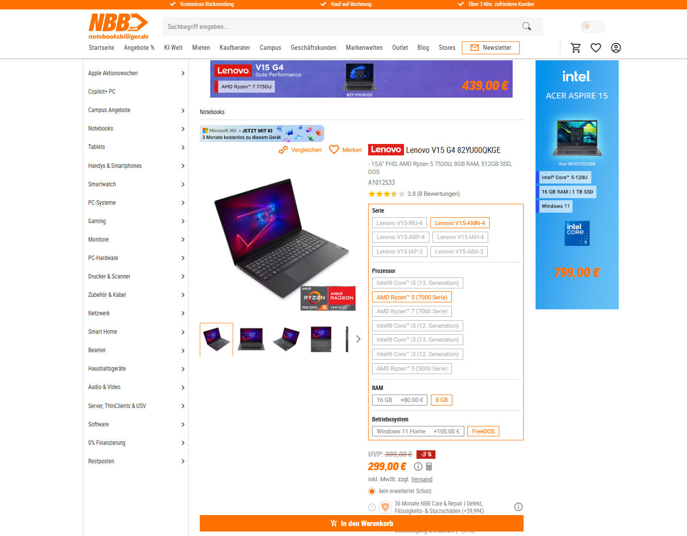 Lenovos V-Modelle zählen zu den einfachen, recht preisgünstigen Office-Notebooks. Die Zielgruppen stellen sowohl Privatnutzer als auch Unternehmen und Organisationen dar. Aktuell führt Notebooksbilliger.de mit dem V15 G4 AMN einen AMD-basierten Vertreter der Serie zu einem Preis von 299 Euro im Sortiment.