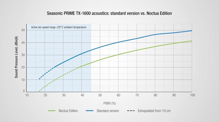 Trotz der hohen Leistung soll das ATX 3.1 PC-Netzteil praktisch geräuschlos arbeiten. Laut der Angaben von Noctua wird das Netzteil bei einer Umgebungstemperatur von 25 Grad Celsius bis zu einer Auslastung von rund 50 Prozent passiv gekühlt, womit dieses absolut geräuschlos bleibt, und selbst bei maximaler Last sollen die Lüftergeräusche 24 dB bei einer Distanz von einem Meter nicht übersteigen – das wäre in der Praxis kaum zu hören. Zum Vergleich: Das reguläre Seasonic Prime TX-1600 kommt unter denselben Bedingungen auf rund 34 dB, was in einem stillen Raum definitiv zu hören ist.