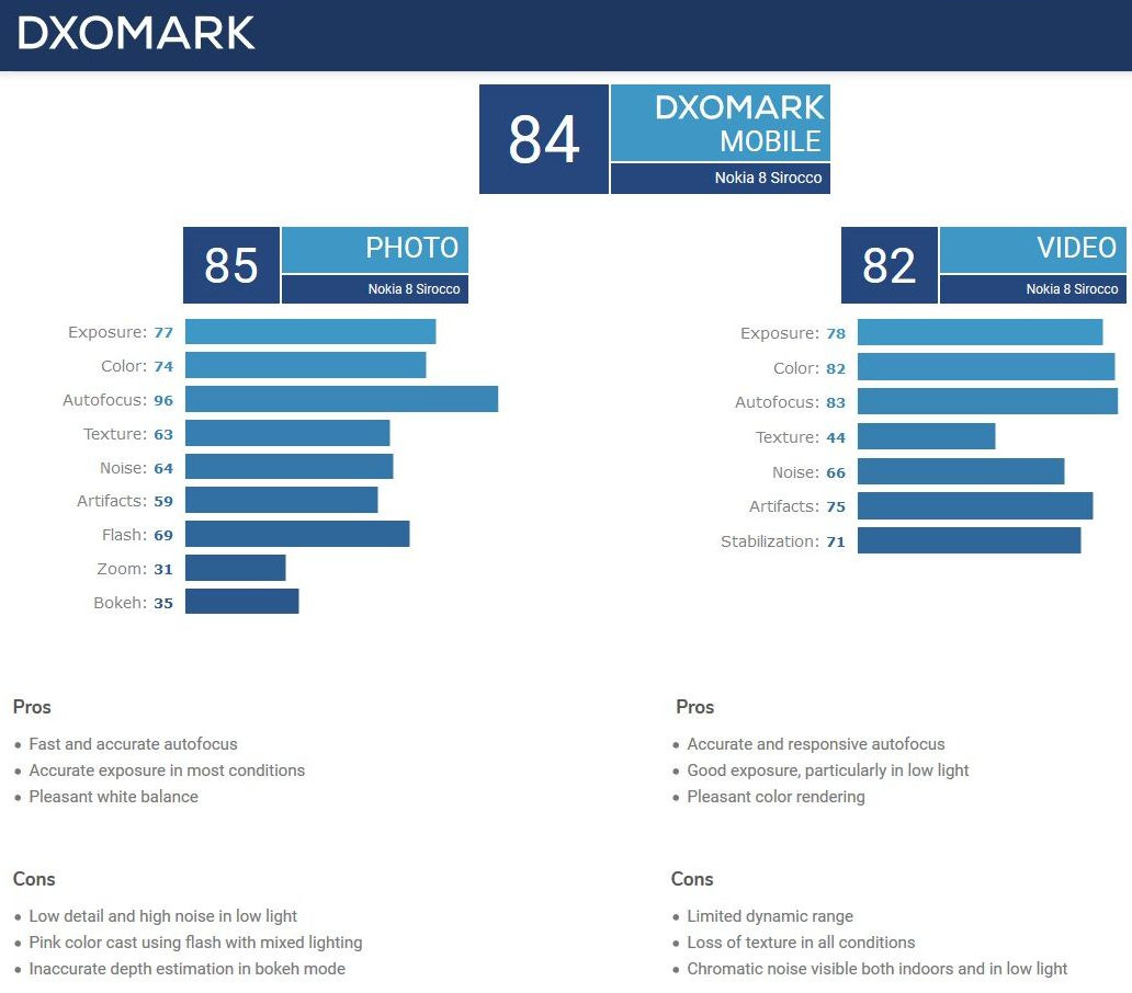 Bei der Foto-Bewertung vergeben die Kameratester den höchsten Sub-Score für den schnellen und sehr präzisen Autofokus des Nokia 8 Sirocco Phones. Außerdem loben die Tester die exakte Belichtung in den meisten Aufnahmesituationen sowie eine(m) gefällige(n) Farbabstimmung/Weißabgleich. Punktabzüge gibt es für das Nokia 8 Sirocco in Low-Light-Situationen. Hier liefert das Nokia 8 Sirocco nur geringe Details bei hohem Rauschen. Außerdem enttäuscht das Sirocco mit einer schwachen Performance bei Zoom und Bokeh.