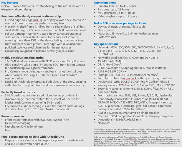 Eine Angabe zur Größe des Akkus vermissen wir leider im Spec-Sheet, allerdings finden wir dafür eine Besonderheit: Das Nokia 8 Sirocco unterstützt nicht nur Wireless Charging sondern auch Quick Charge 4.0, fast eine Rarität am aktuellen Smartphone-Markt. Das LTE-Modem ist mit 14 unterstützten LTE-Bändern so halbwegs world-tauglich, einen Kopfhöreranschluss gibt es aber nicht mehr. Schade. Erwähnenswert zum Abschluss ist natürlich noch die als Android One-Edition vorliegende OS-Installation, das verspricht schnelle Updates und Upgrades. Das Nokia 8 Sirocco wird ab April zum Preis von 749 Euro zu haben sein aber Achtung: Nokia spricht in der Pressemitteilung von einem Preis OHNE Steuern.