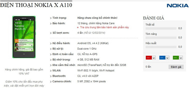 Stimmen die Angaben, dann soll das Nokia X A110 in Vietnam zwischen 2,2 und 2,5 Millionen Dong (VND) kosten, was umgerechnet 76 bis 87 Euro entspricht. Für diesen Preis soll das Nokia X A110 ein 4 Zoll großes Display mit 854 x 480 Pixeln, einen Dualcore Snapdragon 200 respektive S4 Play MSM8225Q (1 GHz), 512 MByte RAM, 4 GByte Systemspeicher, microSD- (32 GB) und Dual-SIM-Unterstützung sowie eine 5-MP-Kamera an Bord haben.