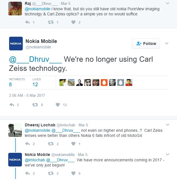 Ein neues Gerücht aus China sagt nun den Juni als möglichen Launch-Termin voraus. Das Gerät soll mit Dual-Kamera, Snapdragon 835-SOC und in zwei Varianten geplant sein, mit kleinerem und größerem Display. 4 oder möglicherweise 6 GB RAM und eine 23 Megapixel-Kamera werden vorhergesagt. Fix ist, dass HMD Global in zukünftigen Smartphones weder die PureView-Technologie der früheren Lumia-Phones noch die Optik von Carl Zeiss einsetzen wird. Erstere verblieb beim Verkauf der Marke Nokia an HMD Global bei Microsoft, und auch den Einsatz von Zeiss-Optiken hat Nokia mittlerweile offen negiert (siehe unten). Ein entsprechendes Bekenntnis konnte man kürzlich auf Twitter nachlesen. Bei der Gelegenheit hat Nokia einmal mehr erwähnt, dass sie gerade erst neu durchstarten und für dieses Jahr noch einiges in petto haben. Lassen wir uns überraschen!