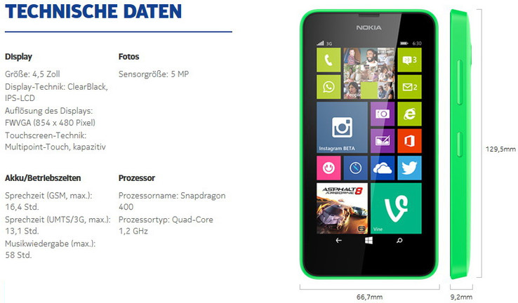 Wie wir berichteten, ist das 134 Gramm schwere und 9,2 Millimeter flache Windows-Phone Lumia 630 mit einem Snapdragon 400 (1,2 GHz) Quadcore-Prozessor von Qualcomm inklusive 512 MByte RAM und 8 GByte Systemmemory ausgestattet. Via microSD-Speicherkarten lässt sich der interne Speicher um bis zu 128 GByte erweitern. Das 4,5 Zoll große IPS-Display (Corning Gorilla Glass 3) zeigt 854 x 480 Pixel.