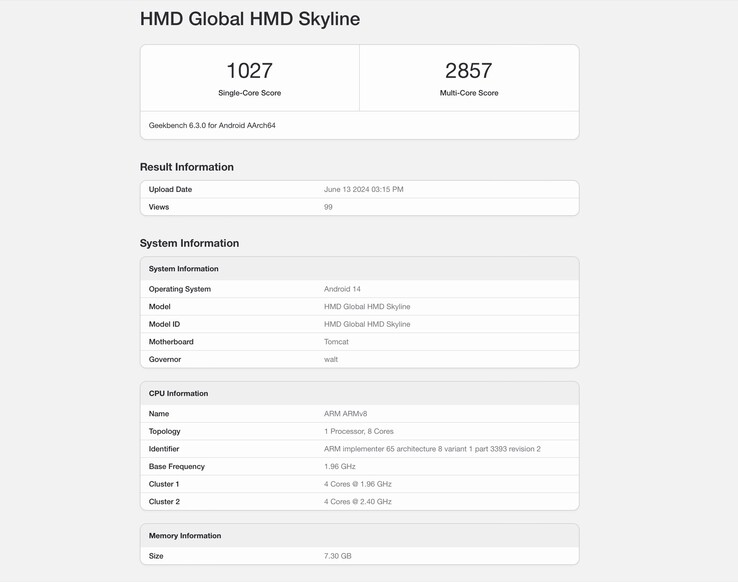 Mit einem Geekbench 6 Single-Thread-Resultat von 1.027 Punkten und einem Multi-Core-Ergebnis von 2.857 Punkten ist der Chip kaum schneller als der Snapdragon 7 Gen 1. Die getestete Variante des HMD Skyline ist mit 8 GB Arbeitsspeicher ausgestattet und läuft bereits mit Android 14. Das HMD Skyline soll am 10. Juli 2024 offiziell vorgestellt werden, und laut früherer Gerüchte für einen Preis von 459 Euro auf den Markt kommen, wobei das Basismodell mit 8 GB RAM und 256 GB Flash-Speicher ausgestattet ist, das Topmodell für 499 Euro soll dagegen 12 GB respektive 256 GB Speicher bieten.