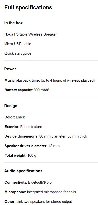 Der neue Nokia Portable Wireless Speaker ermöglicht eine Spielzeit von bis zu 4 Stunden. Für Telefonate ist ein Mikrofon integriert. Für eine hochqualitative Stereo-Audio-Wiedergabe lassen sich zwei Lautsprecher verbinden. Alle Nokia Audiogeräte sind mit Bluetooth 5.0 kompatibel, so dass eine Verbindung mit allen Geräten - auch von anderen Marken - hergestellt werden kann.