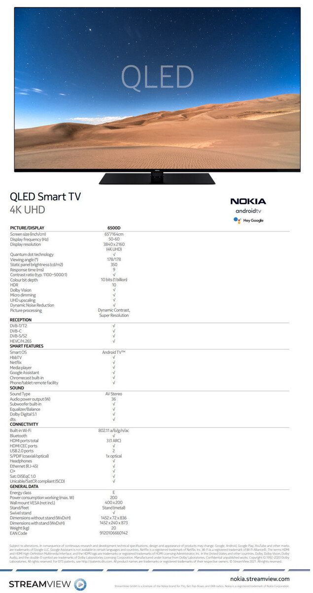 Über Android TV und dem Google Play Store haben Nutzer Zugriff auf über 7.000 Apps. Zudem bieten die Nokia QLED 4K UHD Smart-TVs eine Auswahl spezieller Presets wie Sport, Spiel und Film. Je nach gewähltem Modus werden Farb- und Audioeinstellungen der Nokia QLED-TVs an die Inhalte angepasst. Für den Gaming-Modus nennt StreamView für die Nokia QLEDs eine Reaktionszeit von 8 ms sowie Unterstützung von Dynamic Contrast und UHD-Upscaling. Ein integrierter Subwoofer soll für satte Bässe sorgen.