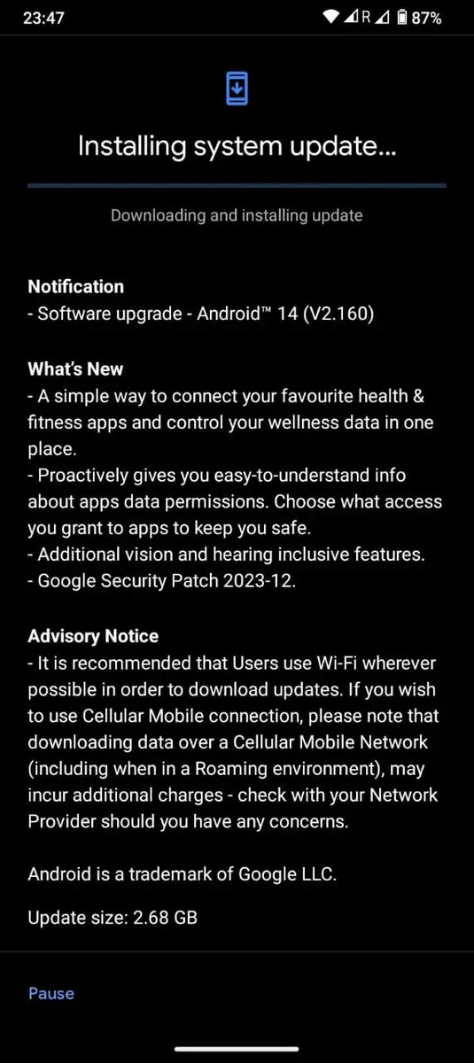 Der Download ist 2,68 GB groß und umfasst neben dem Sprung auf Android 14 mit seinen zahlreichen Neuerungen und Verbesserungen auch den Google Security Patch mit Stand Dezember 2023. Einen umfassenden Überblick über die neuen Features von Android 14 liefert z. B. der offizielle Google-Blog.