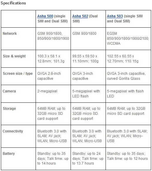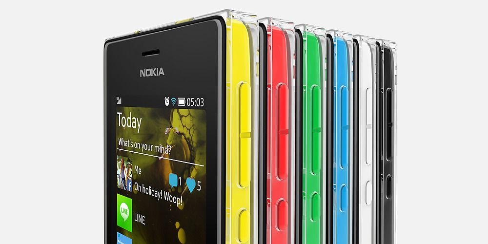 Die Nokia-Phones Asha 500 (2,8-Zoll-Display), Asha 502 und Asha 503 (jeweils 3"-Zoll-Panel) werden laut Nokia im 4. Quartal in den Farben Rot, Grün, Gelb, Cyan, Weiß und Schwarz auf den Markt kommen. Das Nokia Asha 503 unterstützt 3.5G für mobiles Internet und verfügt über ein 3 Zoll großes Display, eine 5-MPixel-Kamera mit LED-Blitz sowie Corning Gorilla Glass 2.