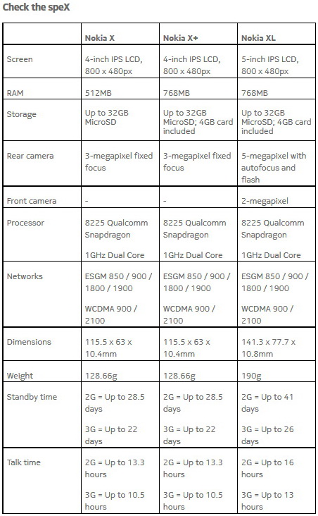 Das Nokia X ist das Einsteigergerät aus der neuen Produktreihe und verfügt über ein 4 Zoll großes IPS-Display, 512 MByte und eine 3-MPixel-Kamera. Das Nokia X+ hat mit 768 MByte RAM und einer microSD-Speicherkarte (4 GB) als Zugabe etwas mehr Speicher. Sowohl das Nokia X als auch das Nokia X+ werden in Grün, Rot, Cyan, Gelb sowie in Schwarz und Weiß verfügbar sein.