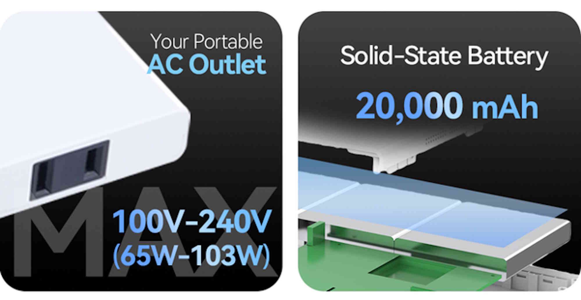 Unterstützt wird auch die Ausgabe von einer höheren Spannung, konkret lassen sich zwischen 100 und 240 Volt ausgeben und dann mit einer Dauerleistung von 65 Watt und einer Spitzenleistung von 103 Watt. Die 708 Gramm schwere Powerbank bringt dabei aber wenig überraschend keine Schuko-Steckdose, sondern eine NEMA-1-Steckdose. Über USB Typ C lassen sich bis zu 60 Watt ausgeben, die Aufladung der Powerbank selbst ist mit maximal 65 Watt möglich. Verbaut ist ein Lüfter zur aktiven Kühlung.