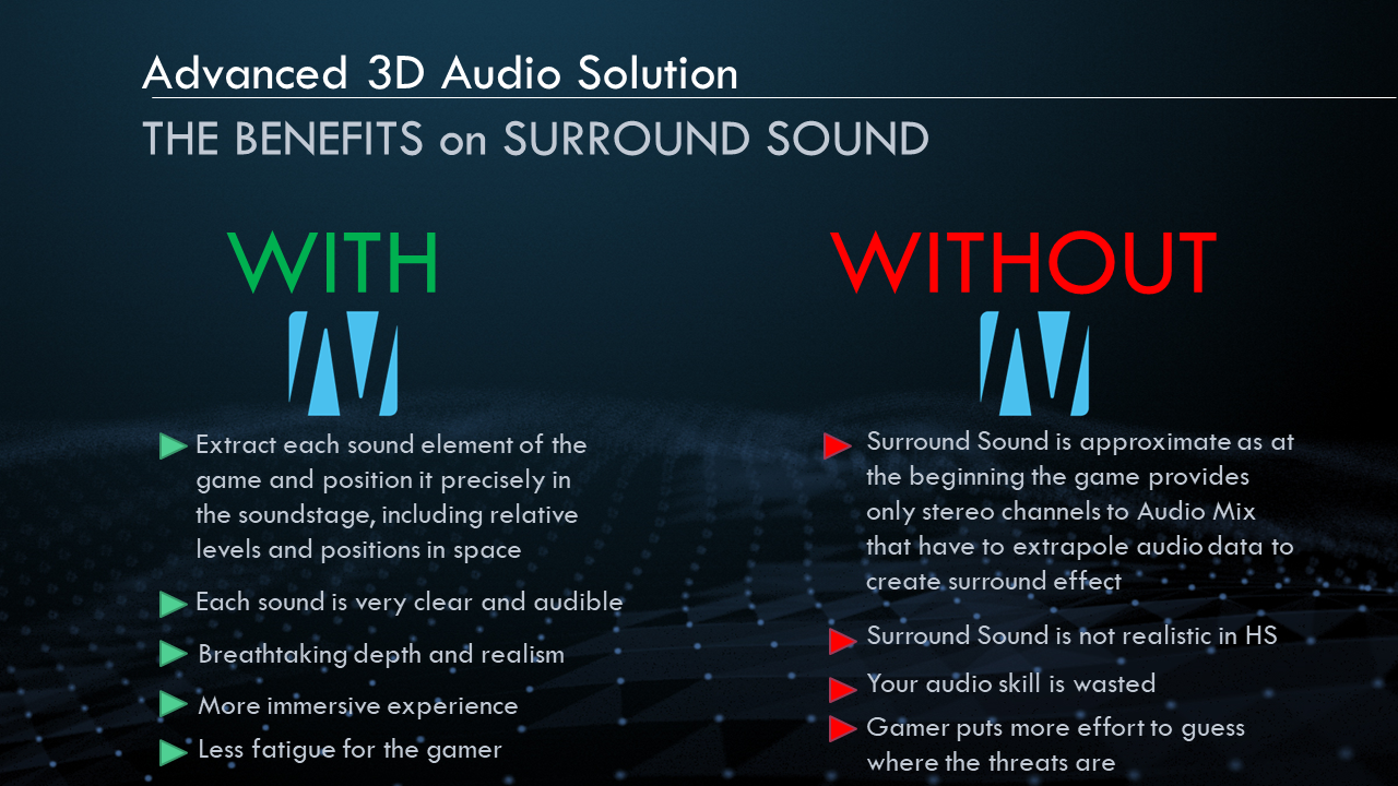 Die meisten Spiele nutzen ebenso wie Multimedia-Software das Windows-Subsystem zur Ausgabe von Audio. Konkret bedeutet dies, dass ein Mehrkanalaudiosignal beim Anschließen eines Stereo-Headsets automatisch auf zwei Kanäle reduziert wird und jeglicher Raumklang, wie zum Beispiel ein sich von hinten nähernder Gegner, im Zuge dessen verloren geht.