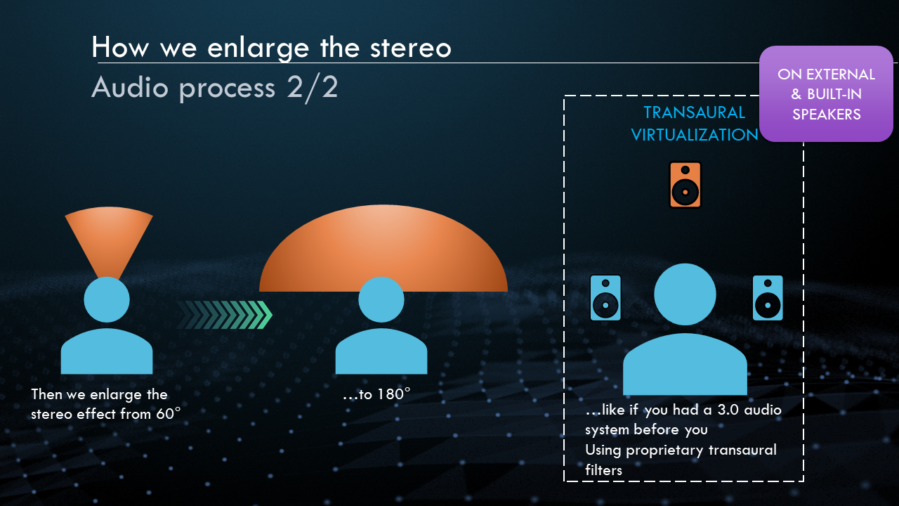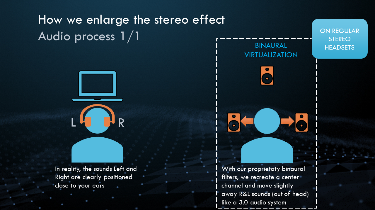Während der transaurale Filter den Stereo-Effekt verstärkt und verbreitert, sorgt ein binauraler Filter für eine Betonung und Verstärkung des zentralen Kanal. In einem Multi-Kanal-Setup wird dieser traditionell für die Wiedergabe von Stimmen verwendet während Umgebungsgeräusch links und rechts davon vorbeigeleitet werden. Diese Technologie erzeugt einen Schalleffekt vergleichbar mit dem eines 3.0-Lautsprechersystems.