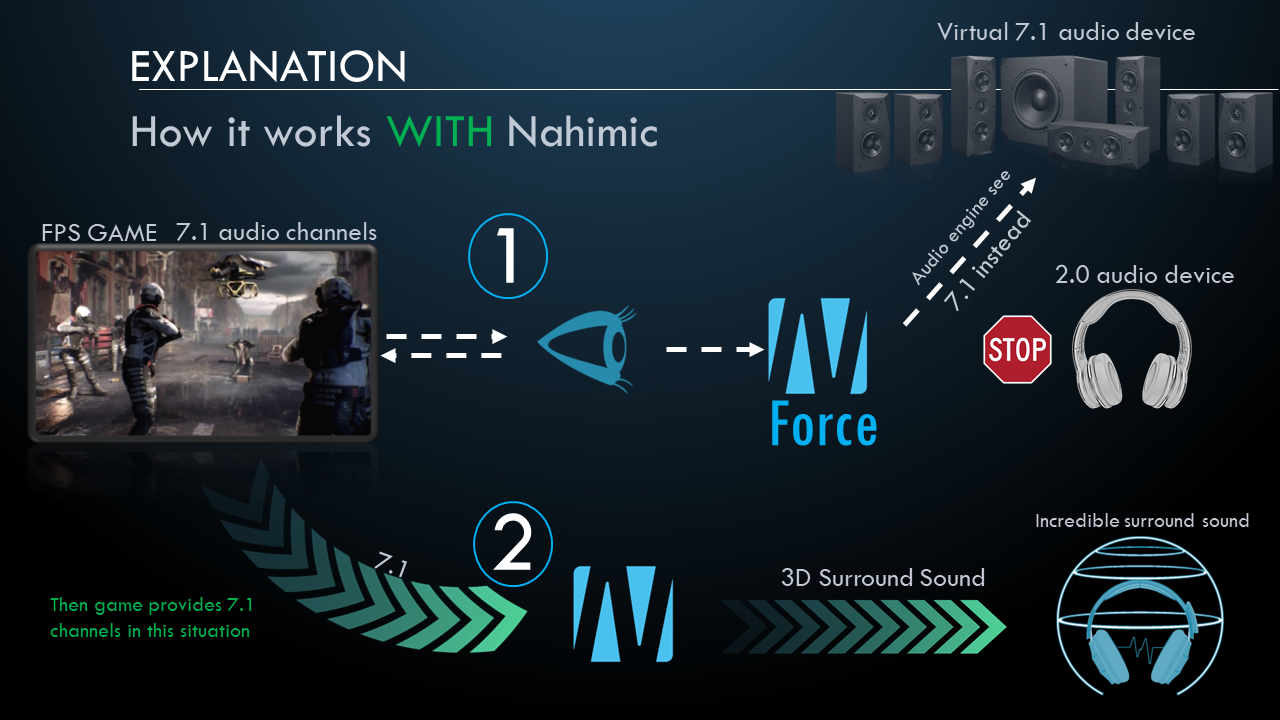 Um dies zu vermeiden setzt Nahimic auf eine Technologie namens N-Force, die den Spielen ein 7.1-Audiosystem vorgaukelt. Dadurch schickt das Spiel weiterhin sämtliche Informationen, auch den Raumklang, an das Audio-Subsystem ohne dabei die zusätzlichen Kanäle zu verwerfen. N-Force sorgt jetzt dafür, dass dieses Tonsignal den sogenannten “Head-Related Transfer Function” Algorithmus (HRTF) durchläuft, der die Position der einzelnen Tonsignale ermittelt und, wenn nötig, das Signal um weitere 3D-Effekte ergänzt. Das Ergebnis ist ein viel tieferes und eindringenderes Spielerlebnis. Dank Nahimic müssen Spieler die Position von Gegnern nicht mehr erraten, sondern können Geräusche ganz konkret im wilden Mix der verschiedenen Tonsignale verorten.
