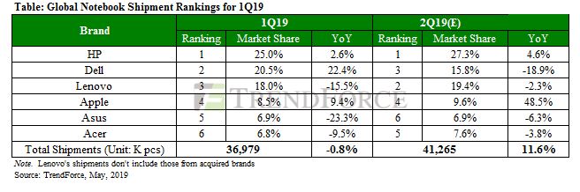 In ihrem Ausblick für das 2. Quartal 2019 rechnen die Analysten von TrendForce damit, dass HP seinen Marktanteil auf 27,3 Prozent ausbauen wird. Der US-amerikanische Computerhersteller Dell dürfte laut TrendForce den Aufwärtsschwung des besonders erfolgreichen Q1/2019 nicht in das zweite Quartal mitnehmen können und auf Platz 3 (15,8 %) rutschen, da Lenovo mit 19,4 % Marktanteil wieder auf Platz 2 vorbeiziehen könnte. Für Apple und Acer rechnen die Marktbeobachter mit leichten Zuwächsen, Asus wird auf Position 6 hinter Acer (5) zurückfallen.