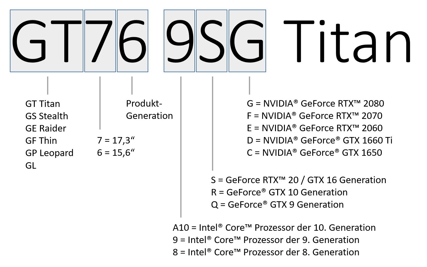 Nach einem Leerzeichen folgen dann drei weitere Zeichen, zum Beispiel „9SG“. Die erste Zahl steht für die Prozessorgeneration, hier die „9“ für die Ausstattung mit einem Intel® Prozessor der 9. Generation. Die weiteren zwei Buchstaben erläutern die Grafikausstattung: Der erste bezeichnet die Grafikgeneration, das „S“ steht im Beispiel für einen NVIDIA® Grafikprozessor der GeForce RTX™-Reihe. Die Sortierung ist alphabetisch, ein „R“ weißt auf eine GeForce GTX™-Grafiklösung hin, dem Vorgänger der RTX-Reihe. Ebenso in alphabetischer Reihenfolge unterteilt der folgende Buchstabe dann die Geräte innerhalb einer Grafikgeneration noch einmal nach Leistungsklassen: Ein GE75 9SG arbeitet mit der GeForce RTX™ 2080 Grafik, ein GE75 9SF mit der GeForce RTX™ 2070 und ein GE75 9SE mit der GeForce RTX™ 2060.