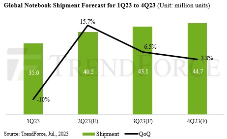 Die Verbrauchernachfrage für Laptops ist im Vergleich zu den Vorjahren deutlich abgeflaut. Laut den Marktexperten von TrendForce sollen im zweiten Quartal 2023 etwa 40,45 Millionen Notebooks ausgeliefert werden, was für den angeschlagenen Laptop-Markt einen sequentiellen Anstieg von 15,7 % darstellt. Dies sei ein Hoffnungsschimmer für den Notebook-Markt, nach sechs aufeinanderfolgenden Quartalen des Rückgangs, so TrendForce.