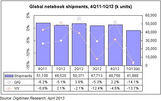 Vergangene Woche meldeten die Marktanalysten von IDC und Gartner einen dramatischen Einbruch der Verkaufszahlen bei Notebooks und PCs im 1. Quartal 2013. IDC verzeichnete für den PC-Markt in Q1/2013 einen Einbruch von 13,9 Prozent, Gartner von 11,2 Prozent. Laut einem aktuellen taiwanischen Marktbericht gab es beim weltweiten Liefervolumen für Notebooks in Q1/2013 sogar eine Rekordminus.