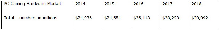 Gemäß den Marktanalysten von Jon Peddie Research (JPR) wird der weltweite Markt für PC-Gaming-Hardware in 2015 leicht um rund 1,15 Prozent, von 24,936 Milliarden auf 24,648 Mrd. US-Dollar zurückgehen. Insgesamt und im Vergleich zum übrigen PC-Geschäft bleibt dieses Marktsegment aber stabil und wird in den kommenden Jahren sogar wieder deutlich zulegen können, so JPR. Auch die Umsätze mit Gaming Notebooks sollen sich weiterhin positiv entwickeln.