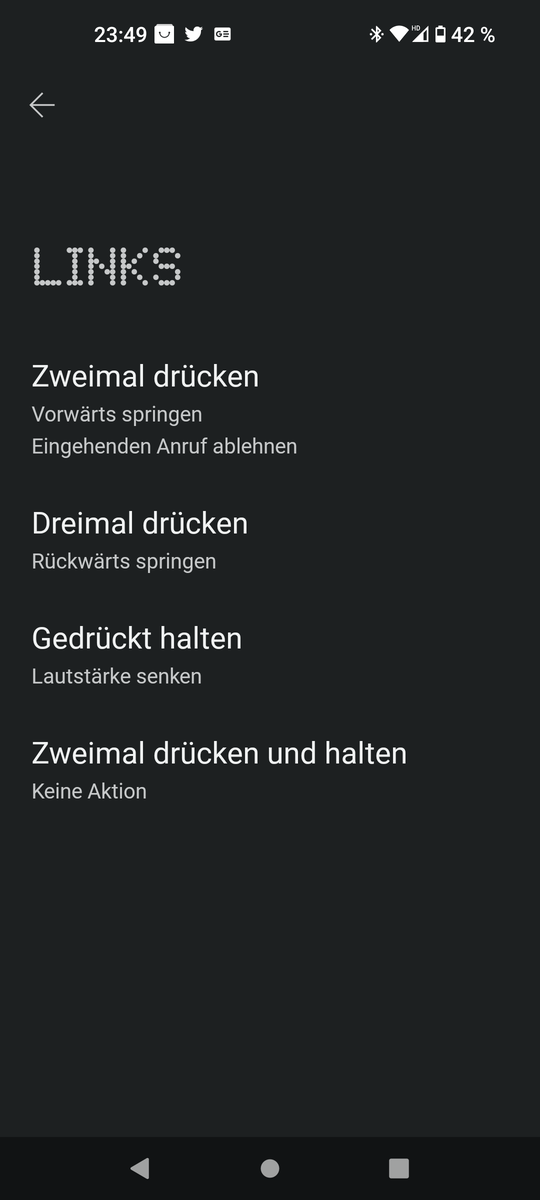 In den Gerätedetails kann auch die Tastenbelegung geändert werden. Einmal, zweimal und dreimal Drücken sowie Drücken und Halten und zweimal Drücken und Halten können die TWS-Kopfhörer unterscheiden. Hier kann auch die Trage-Erkennung eingestellt und der Modus mit niedriger Latenz ausgewählt werden. Ohne Nothing Phone (1) sind trotzdem alle Einstellungen per Nothing X App abrufbar. Die App ist dabei grafisch an die Optik von Nothing OS angelehnt.