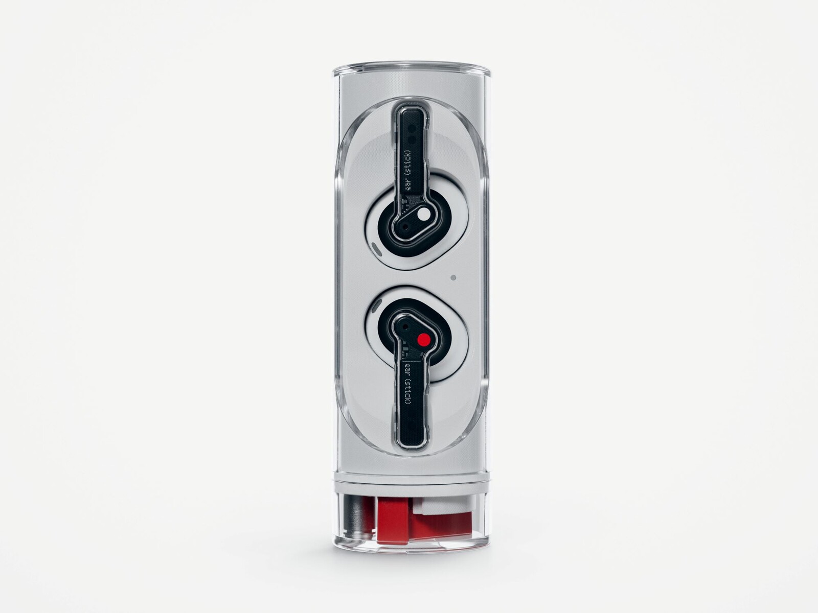 Das Design der Kopfhörer erinnert stark an die transparenten Geräte aus den 90er-Jahren. Durch das Polycarbonat kann man Details wie die Antennen oder auch die kleinen Chips auf der Platine im Inneren erkennen. Akkus und Lautsprecher sind aber versteckt im weißen Teil des Gehäuses. Auch das Ladeetui hat einen großen Anteil an durchsichtigem Kunststoff. Hier sieht man jedoch nur Designelemente und keine technischen Bauteile.