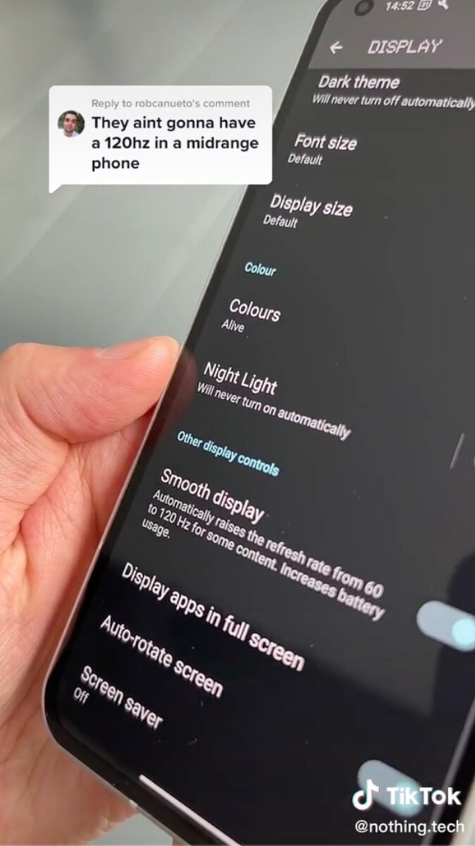 Ein weiteres TikTok-Video zeig außerdem den direkt ins Display integrierten Fingerabdrucksensor in Aktion. Dieser reagiert in etwa so schnell, wie man das von einem aktuellen Mittelklasse-Smartphone erwarten würde, die Sensoren einiger Flaggschiffe reagieren deutlich schneller. Dieser Sensor ist auch im unten eingebetteten Video von Nothing zu sehen, und zwar bei Minute 04:18, wenn die Rückseite des Displays in die Kamera gehalten wird.