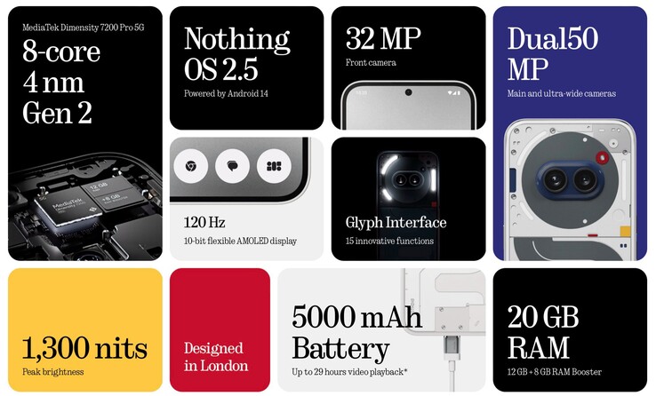 Dabei packt Nothing dunkelgraue, blaue, rote und gelbe Farbakzente unter die transparente Rückseite, wodurch das Gerät einen charmanten Retro-Look erhält. Die als "Glyph Interface" bekannten LED-Streifen rund um das Kameramodul bleiben unverändert, und auch an der Ausstattung ändert sich ansonsten nichts. Demnach setzt das Smartphone wie gehabt auf einen MediaTek Dimensity 7200 mit zwei ARM Cortex-A715 Performance-Kernen und sechs Cortex-A510 Effizienz-Kernen sowie auf ein 6,7 Zoll großes, 120 Hz schnelles AMOLED-Display mit einer Spitzenhelligkeit von 1.300 Nits.